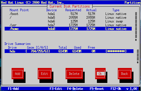The Drive Summaries section is displayed only to indicate your computer's disk configuration. It is not meant to be used as a means of specifying the target hard drive for a given partition. This is described more completely in the section called Adding a Partition. |