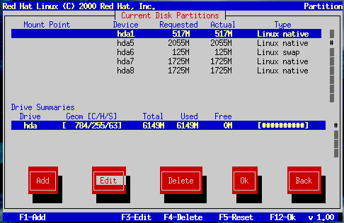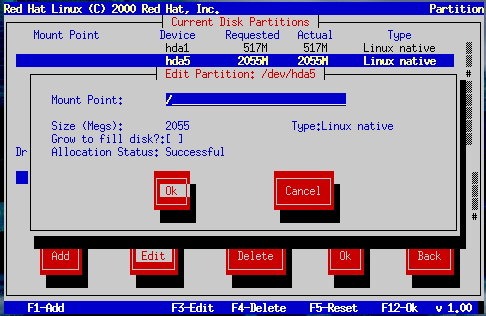 Edit -- Modify the mount point of the partition currently highlighted in the Current Disk Partitions section. Selecting this button will cause a dialog box to appear allowing you to change the name of the mount point.