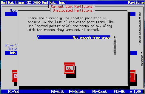 If you attempt to add a partition and Disk Druid can't carry out your request, you'll see a dialog box listing any partitions that are currently unallocated, along with the reason they could not be allocated, as in Figure 14-17. Select the OK button, and press Space to continue. Note that the unallocated partition(s) are also displayed on Disk Druid's main screen (though you may have to scroll the Current Disk Partitions section to see them).