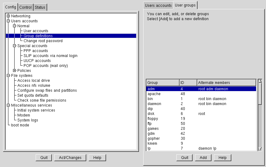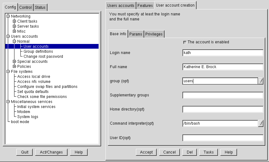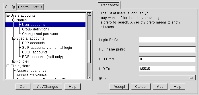 Abrir Config => Users accounts => Normal => User accounts. Puede que Linuxconf muestre una pantalla filtro (véase ).