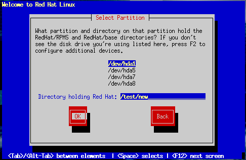 Introduzca el nombre del dispositivo de la partición que contiene el directorio RedHat. Existe también un campo definido como Directory holding Red Hat. Si el directorio RedHat no se encuentra en el directorio raíz de esa partición, introduzca la ruta para el directorio RedHat (por ejemplo, si el directorio RedHat se encuentra en /test/new/RedHat, introduzca /test/new).