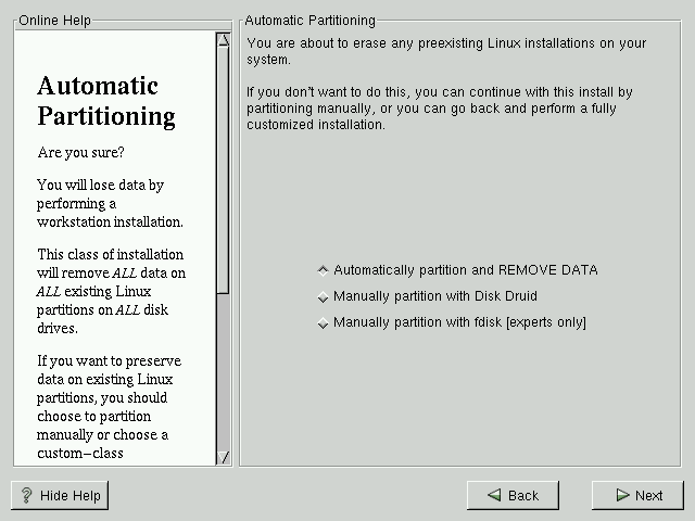 La opción de Partición Automática se encuentra disponible solamente si se efectúa una instalación de clase Workstation o Server. Si está siguiendo una instalación de clase custom, o ha elegido la partición manual del disco,veáse .