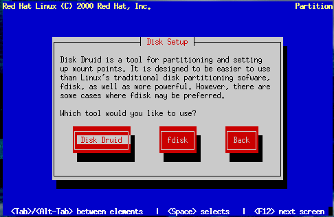 Si elige una instalación personalizada, elija también qué aplicación usar para hacer particiones en el disco. Esta elección es adecuada solo si ha optado por usar fdisk.