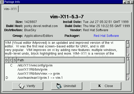 Si vous recherchez un paquetage déjà installé, deux boutons supplémentaires s'affichent au bas de cette fenêtre : Verify et Uninstall. Si vous effectuez une interrogation sur un paquetage non encore installé, les boutons situés au bas sont étiquetés Install, Upgrade et Check Sig.