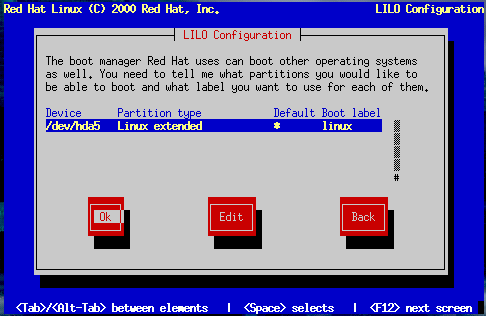 Il y a également une colonne intitulée Par défaut. Dans cette colonne, une seule partition contient un astérisque. La partition marquée comme partition par défaut est celle que LILO démarre à défaut de réaction de l'utilisateur durant le processus de démarrage. Initialement, la partition root pour votre installation de Red Hat Linux sera sélectionnée comme partition par défaut. Si vous voulez changer de partition par défaut, utilisez les touches de direction pour mettre en surbrillance la partition qui doit être celle par défaut, puis appuyez sur F2. L'astérisque se déplace vers la partition sélectionnée. Lorsque vous avez terminé, sélectionnez OK, puis appuyez sur la barre d'espacement.