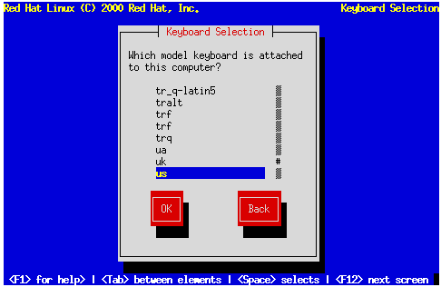 Après avoir sélectionné le type de clavier approprié, appuyez sur Entrée ; le type de clavier sélectionné est automatiquement chargé pour le reste du processus d'installation ; il le sera également à chaque démarrage du système Red Hat Linux.