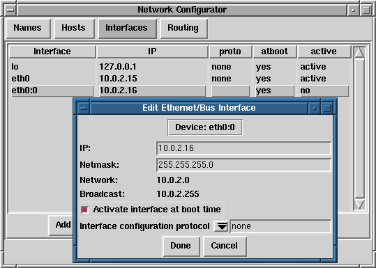 Après avoir fourni les informations de configuration pour votre nouveau périphérique, cliquez sur Done. Le périphérique doit apparaître dans votre liste Interfaces comme périphérique inactif (la colonne active doit porter un libellé no). Pour activer le nouveau périphérique, commencez par le sélectionner d'un clic de souris, puis sélectionnez le bouton Activate. S'il ne s'active pas correctement, vous devez peut-être le reconfigurer en sélectionnant Edit.