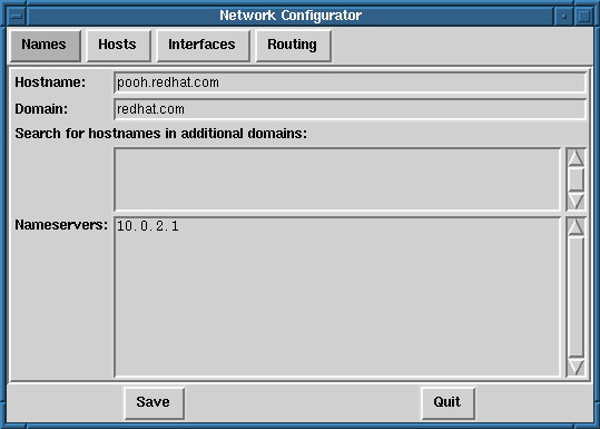 Le cadre Names de l'outil de configuration de réseau sert deux objectifs fondamentaux : définit le nom d'hôte et le domaine de l'ordinateur, et détermine le serveur de noms qui sera utilisé pour rechercher d'autres hôtes sur le réseau. L'outil Network n'est pas capable de configurer un ordinateur comme serveur de noms. Pour éditer un champ ou y ajouter des informations, cliquez simplement sur le champ avec le bouton gauche de la souris, puis tapez les nouvelles informations.