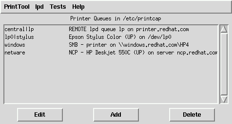 Pour créer une nouvelle file d'attente d'impression, sélectionnez Add. Ensuite, sélectionnez le type d'imprimante ajoutée. Il existe quatre types de files d'attente d'impression qui peuvent être configurées à l'aide de printtool :