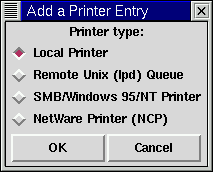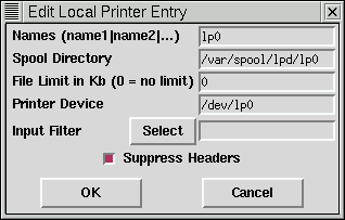 Printer Device — Généralement /dev/lp1 ; nom du port auquel l'imprimante est connectée. Les imprimantes série sont habituellement connectées aux ports /dev/ttyS? . Notez que vous devrez configurer manuellement des paramètres série.