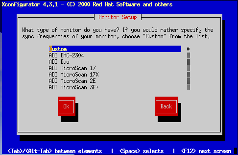 Tout d'abord, Xconfigurator présente une liste d'écrans (voir la Figure 14-43). Si le vôtre y figure, sélectionnez-le, puis appuyez sur Entrée. Sinon, sélectionnez Personnalisée.