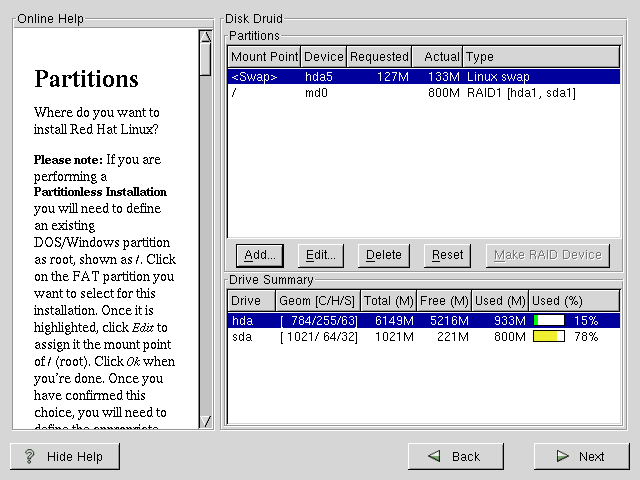 Il RAID è disponibile in entrambe le modalità di installazione GUI e kickstart. Potrete utilizzare l'fdisk o il Disk Druid per creare la vostra configurazione RAID, ma queste istruzioni saranno focalizzate sull'utilizzo di Disk Druid per completare questa operazione.