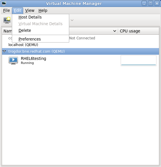 virt-manager, also known as Virtual Machine Manager, provides a graphical tool for administering virtual machines. It uses libvirt-client library as the management API.