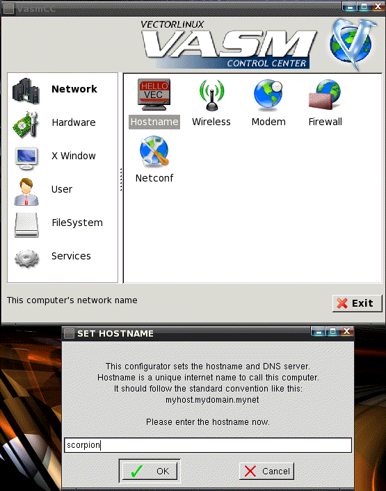 CONTENTS1. VasmCC 2. vpackager 3. vcpufreq 4. vleasytables 5. vl-hot-config 6. vlsmbmount 7. vwifi 8. wifi-radar VectorLinux v5.9 provides users with a number of new system tools to make administration of their computer system easier than hand-editing configuration files. These utilities are described in detail below, but for the most part, their usage is trivial and obvious. Where that is not the case the intracacies are explained. 1. VasmCCVasmCC is the VectorLinux Control Centre. It provides an iconic GUI interface to vasm, and is modelled upon Suse Linux's YAST software. VASM is the Vector Administration and System Menu, fully explained in the VASM manual. VASM itself is an ncurses based text menu interface, which may appear archaic to some, but is fully functional nonetheless. VasmCC is simply a GUI wrapper to vasm. It is still under development as at February 1st, 2008. There is presently more functionality to the system adminstrator by using vasm rather than VasmCC. The images below show the basic functionality of this sofware.