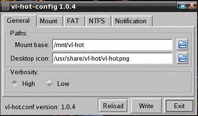 5. vl-hot-config"vl-hot-config" provides simple configuration to the VectorLinux automounting system called vl-hot. vl-hot is a purely udev based automount system for any kind of pluggable storage device that conforms to the block device specification (and so it uses scsi emulation). It was officially included in Vector Linux 5.1 SOHO and subsequent releases. Hardware known to work with vl-hot are USB pendrives, hard disks, digital cameras, memory card readers, PCCARD (or PCMCIA) memory cards and external USB drives. Firewire devices should work, but there are no user reports on this kind of hardware yet. More information on vl-hot and its differences to the HAL autmount system are found in the VL mounting manual and the VL external devices manual. The working specifications of vl-hot are such that the mount base directory will be "/mnt/vl-hot/", each drive will have a "sd?" directory (where "?" represents a letter of the alphabet) and each mounted partition will have a "vol#" directory (where "#" represents a number) within the drive directory. An exception to this rule is in the case of non-MBR devices, where there is no partition table. Desktop icons are dynamically created/deleted (currently only for KDE and xfce) and these have an unmount options in the context (right-click) menu. There is a conventional unmount (should be used normally) as well as options for unmount with signalling to the process that is holding open the mount and unmount with killing of said process (the last two should be tried in that order, when the normal unmount fails). The unmount operation has completed succesfully once the desktop icon disappears. vl-hot-config enables the user to change the base mount directory, the mount icon, what should be included and automatically excluded from the mount process, the log file locations, sound notifications and mount specifics depending on filesystem type. The image below shows the basic functionality of vl-hot-config.