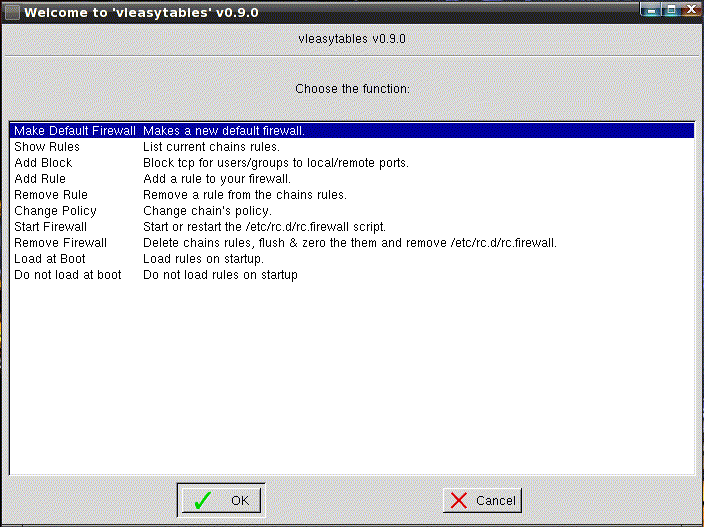 4. vleasytables"vleasytables" is a simple, unique, menu driven utility which enables a user to rapidly build their own custom firewall. It is basically a front end to the Linux software utility "iptables" and therefore requires root access. The utility enables one to also start and stop the firewall and have the firewall loaded on every boot. This utility should only be used with those having a reasonably good knowledge of firewalls and iptables. The image below shows the basic functionality of vleasytables.