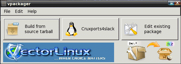 2. vpackagervpackager is VectorLinux's new utility which enables users to build a properly packaged VL .tlz package from source code. A complete explanation of the VL package management system (gslapt and slapt-get) is found in our slapt-get/gslapt/packages manual. The user is also referred to our forum where a full explanation on how to build a package is described.vpackager documentation is fully explained at the vpackager website, so will not be fully re-iterated here. Newer Linux users should be aware that vpackager is not required to install or remove packages. Such functionality is provided instead by "gslapt". The image below shows the basic functionality of vpackager.