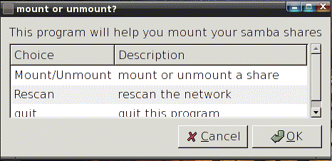 6. vlsmbmount"vlsmbmount" is simply a front end menu message to the xsmb.sh shell script, which assists a user in connecting their computers via Samba. For this system to work the user must have the smbd and nmbd service daemons running beforehand. To do so go to System, VASM, SUPER, SERVICE, SRVSET, 4 and enable the Samba daemon. The images below shows the basic functionality of vlsmbmount.