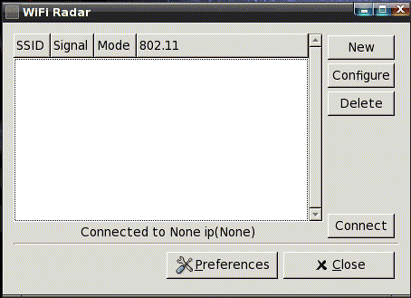 7. vwifi"vwifi" is a relatively simple bash script which attempts to detect the user's wireless card device and to launch the wifi services via the iwconfig, dhcpcd and ifconfig network commands. If it does not find an appropriate module for your device it will ask you for an appropriate one from a supplied list. The user should know what module to choose. To know this the user must determine his/her chipset within the wireless device (use "lspci") and then visit this Linux wireless site. Any further questions regarding problems about VL and wireless might be solved by reading our wireless HOWTO. 8. wifi-radar"wifi-radar" enables you to scan for available networks and create profiles for your preferred networks. At boot time, running WiFi Radar will automatically scan for an available preferred network and connect to it. You can drag and drop your preferred networks to arrange the profile priority. For further information visit the wifi-radar website. The image below shows the basic functionality of wifi-radar.